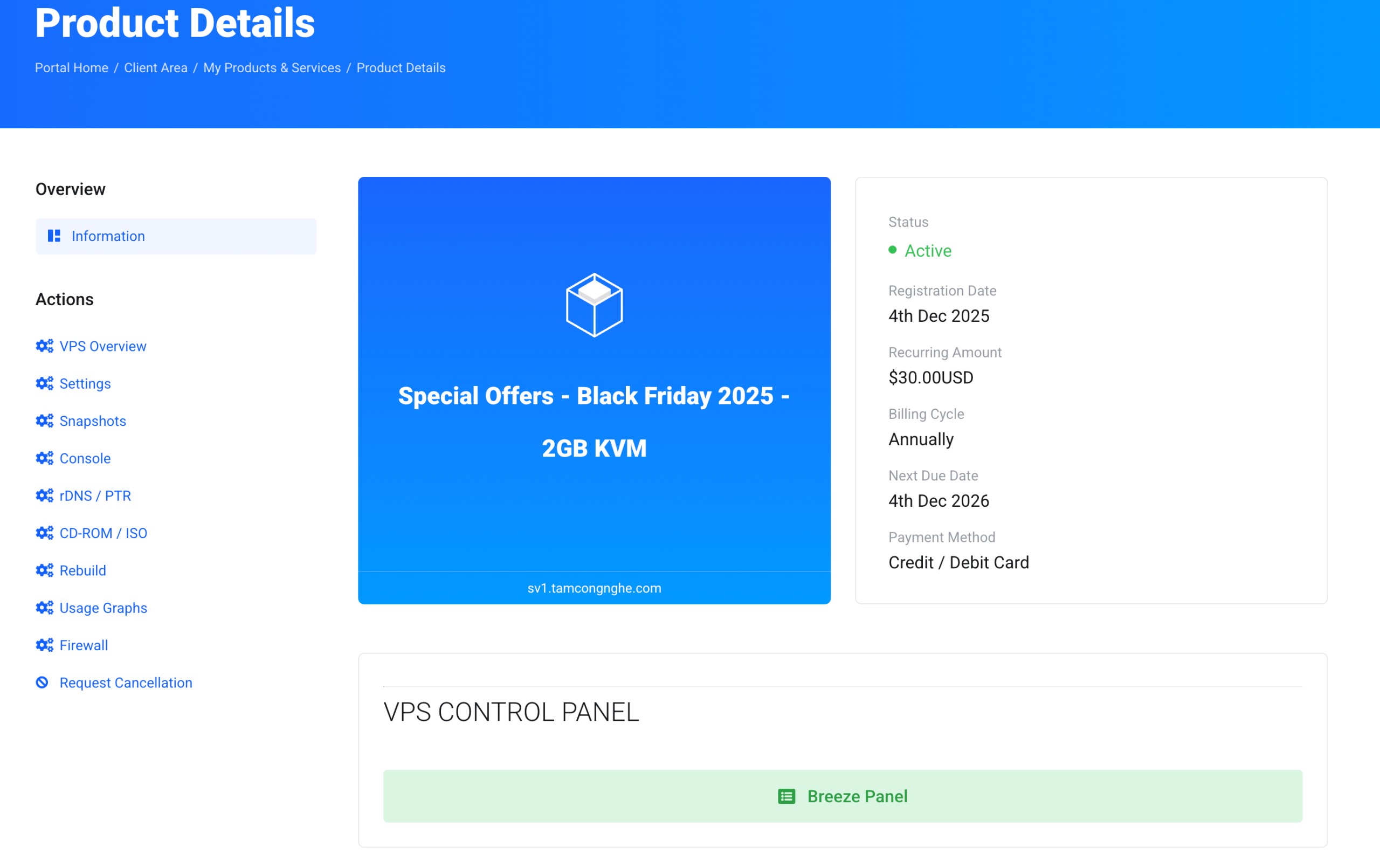 Còn dưới đây là thông tin về giá và cấu hình mà họ đưa ra. Toàn bộ đều chạy ảo hoá KVM, CPU dùng chip Ryzen, ổ cứng NVMe chạy chế độ RAID-1 (tức dữ liệu VPS của bạn sẽ lưu đồng thời lên 2 ổ NVMe khác nhau, nếu hỏng 1 trong 2 thì vẫn chạy bình thường). Quản trị VPS sử dụng Breeze Control Panel khá thân thiện và dễ thao tác. Có hỗ trợ luôn chạy Windows nếu mua gói có RAM từ 2GB đổ lên. Ngoài ra họ còn cho tạo tối đa 3 bản snapshots của toàn bộ VPS miễn phí.