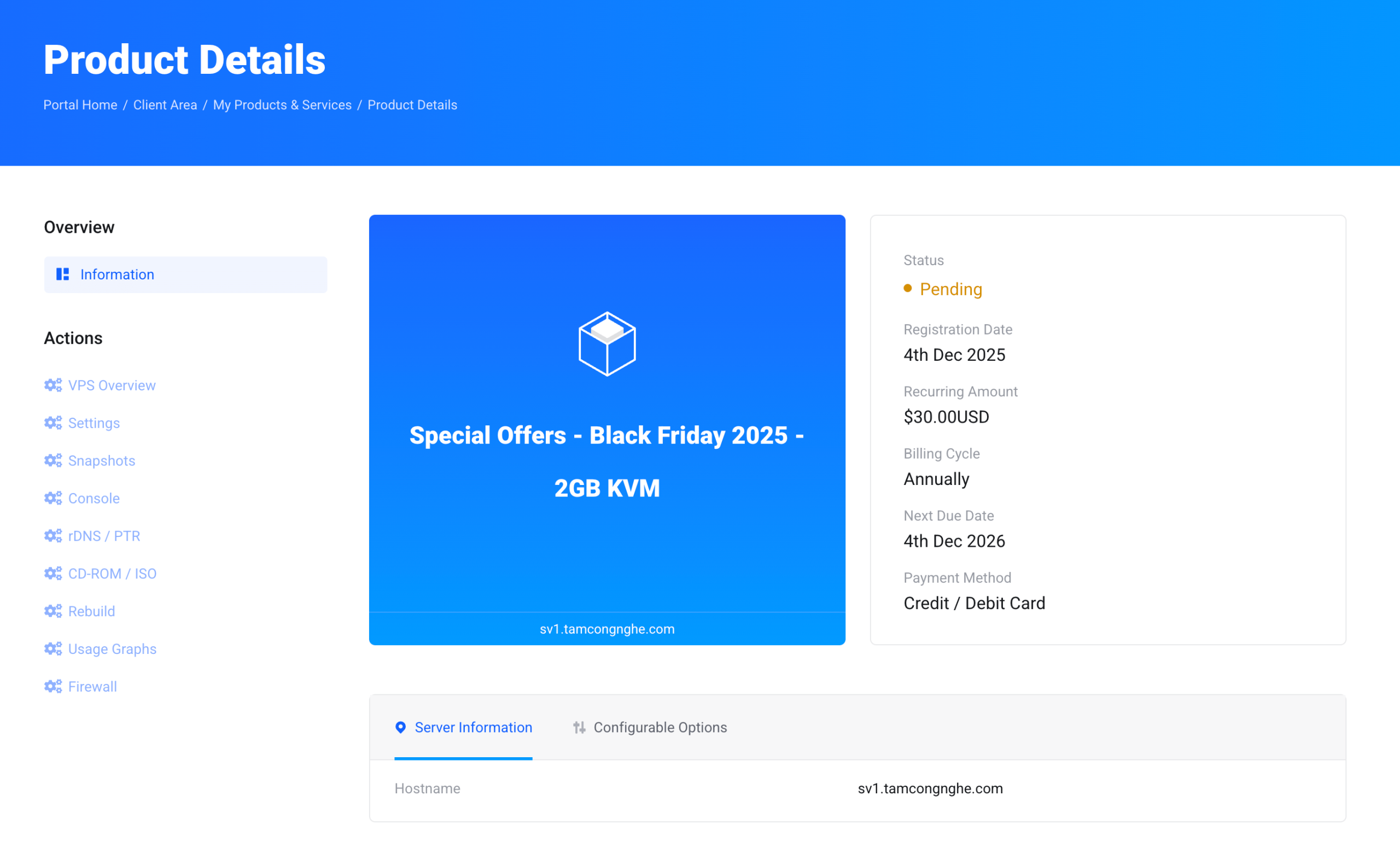 Sau khi thanh toán thành công, VPS sẽ ở trạng thái “Pending”, mình phải đợi khoảng 30 phút để họ kích hoạt. Nếu anh em rơi vào trường hợp giống mình thì cứ kiên nhẫn chờ đợi, nếu lâu quá thì mở ticket giục họ check nhanh hơn.
