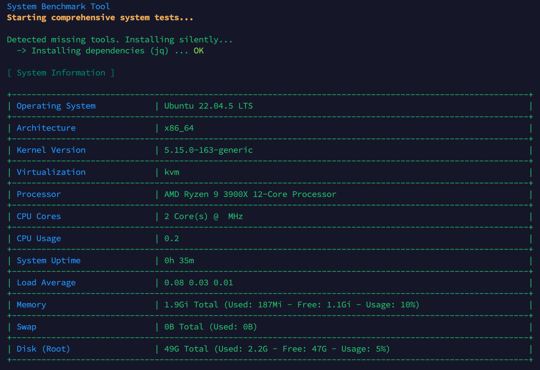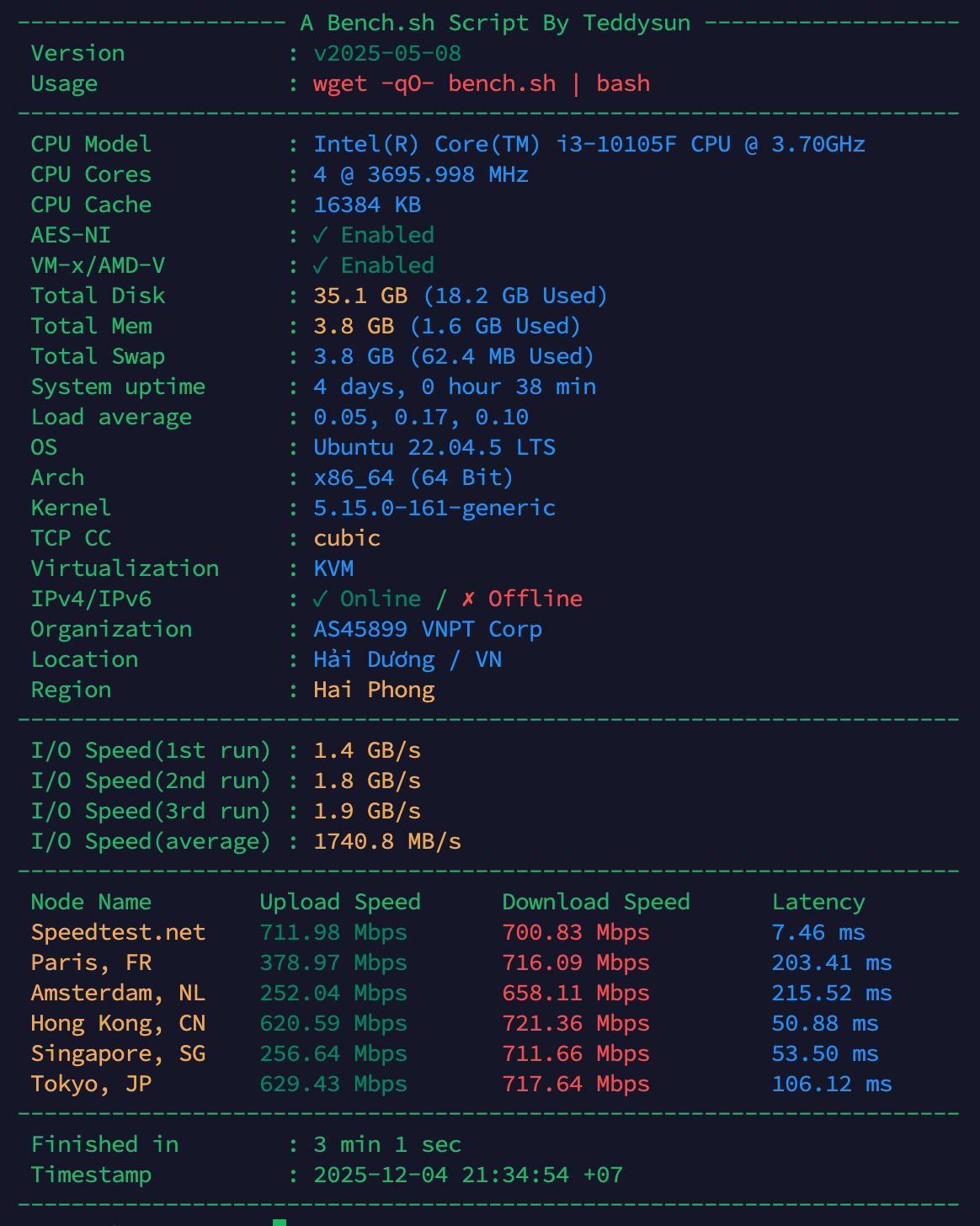 Đây là script đơn giản, rất phổ biến để test nhanh VPS/server. Khi chạy, nó sẽ kiểm tra thông tin hệ thống (CPU, RAM, ổ đĩa…), test I/O disk, test tốc độ mạng.
