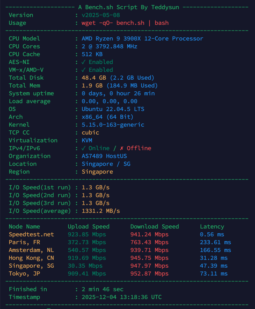 - Tốc độ mạng: VPS HostUS Singapore có băng thông cao hơn đáng kể (gần 1 Gbps) và latency thấp hơn khi kết nối đến các server châu Á.