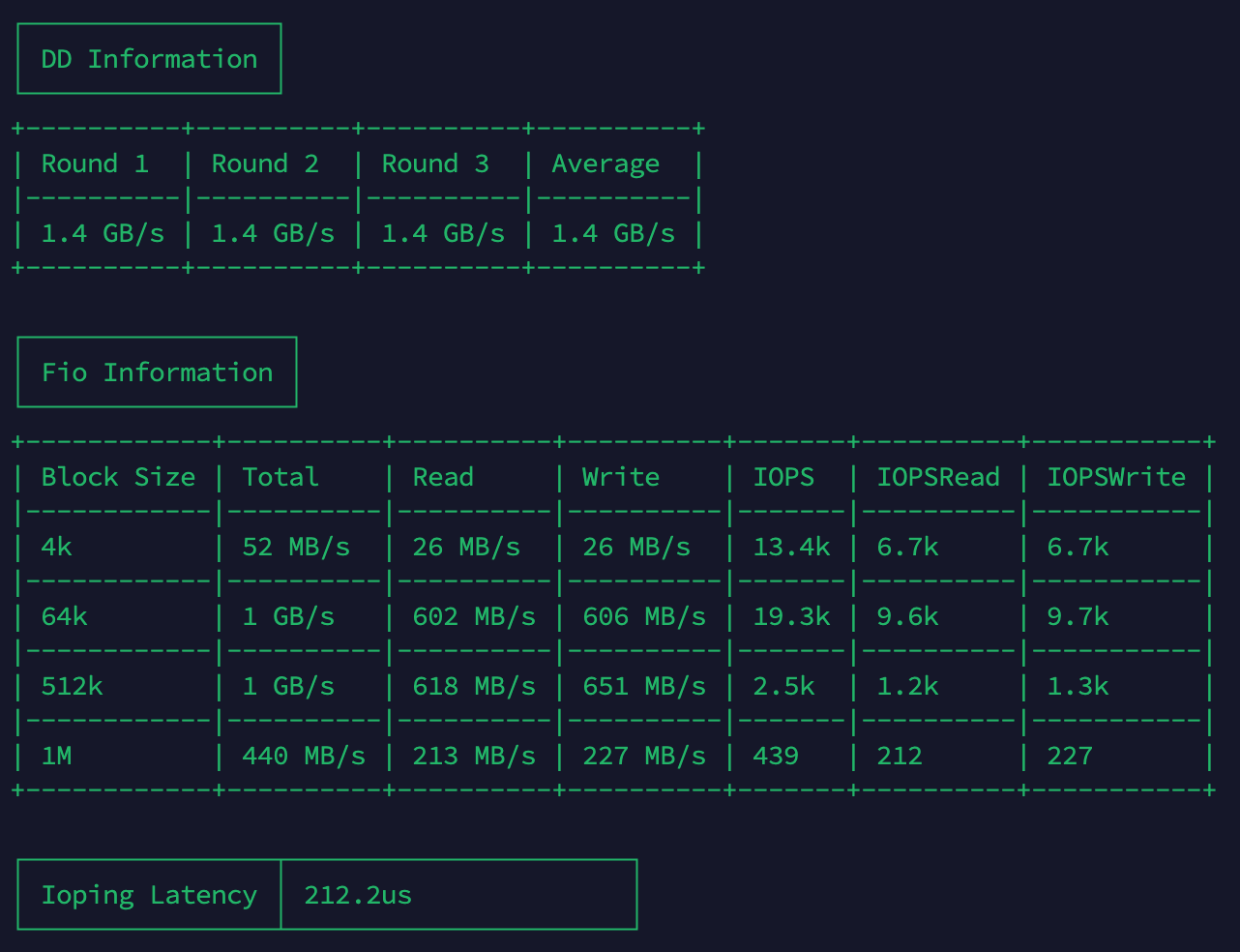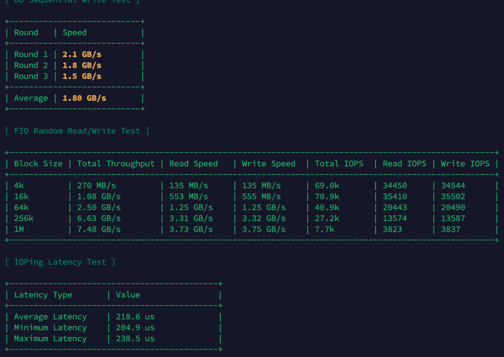 - Kết quả 1.4 GB/s ổn định qua 3 vòng test là rất tốt cho một VPS. Đây là mức hiệu năng cho thấy VPS sử dụng ổ NVMe thật. So với benchmark tiêu chuẩn, các VPS cao cấp thường đạt từ 1-2.5 GB/s ở test này.