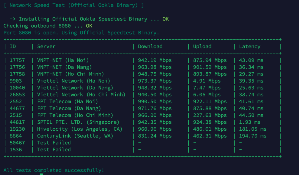 - Singapore (SPTEL): 896/880 Mbps, latency 1.962ms – gần như local traffic, cực kỳ nhanh