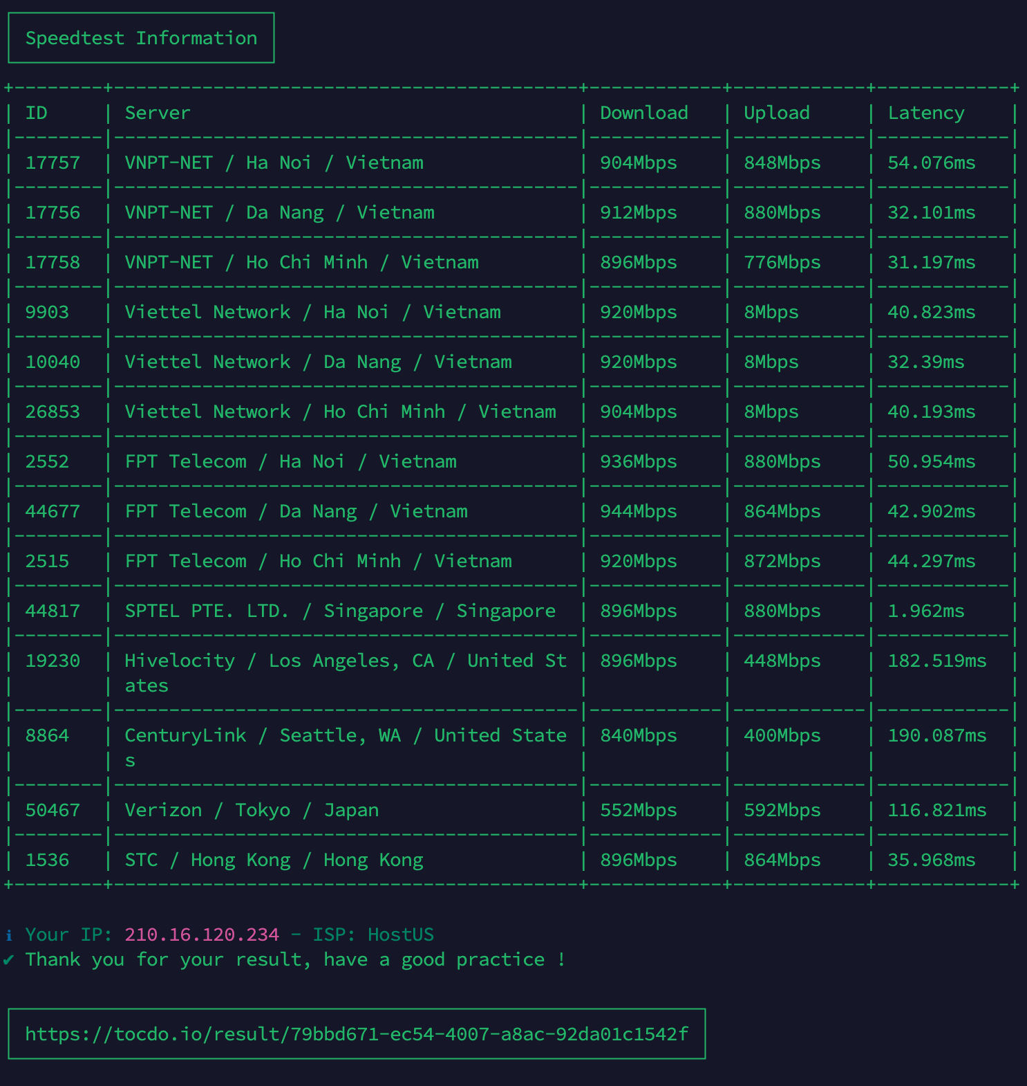 - Điểm nổi bật: Tốc độ download về Việt Nam gần như đạt full 1Gbps với cả 3 ISP lớn, latency 31-54ms là mức rất tốt cho VPS Singapore. Tuy nhiên, upload qua Viettel chỉ đạt 8 Mbps là điểm bất thường, có thể do routing hoặc vấn đề peering giữa HostUS và Viettel, mình sẽ tìm hiểu nguyên nhân và thông tin cho anh em (nhưng download mạng Viettel vẫn bình thường cho nên không ảnh hưởng đến khách truy cập cho lắm).