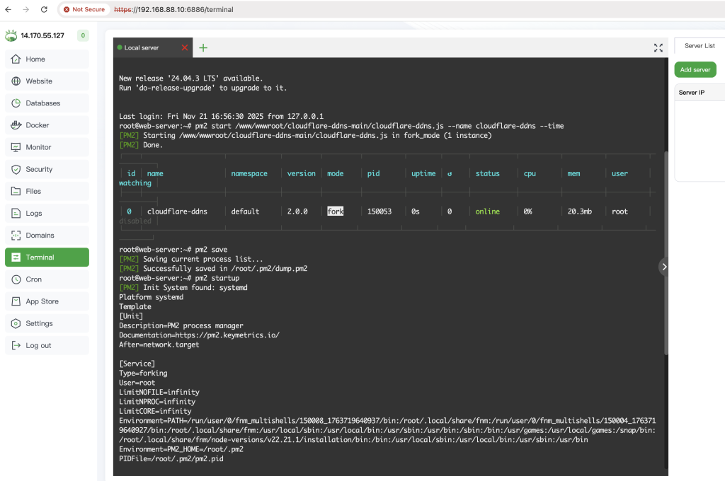 Tiếp tục nhập lệnh sau để lưu cấu hình PM2 và tự động khởi chạy khi reboot