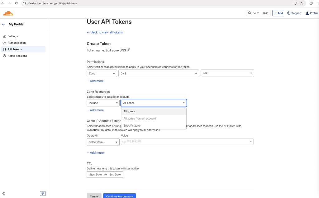 Trong mục Zone Resources, đổi từ Specific zone thành All zones. Các mục khác để nguyên, kéo xuống dưới cùng chọn Continue to summary rồi chọn Create Token.