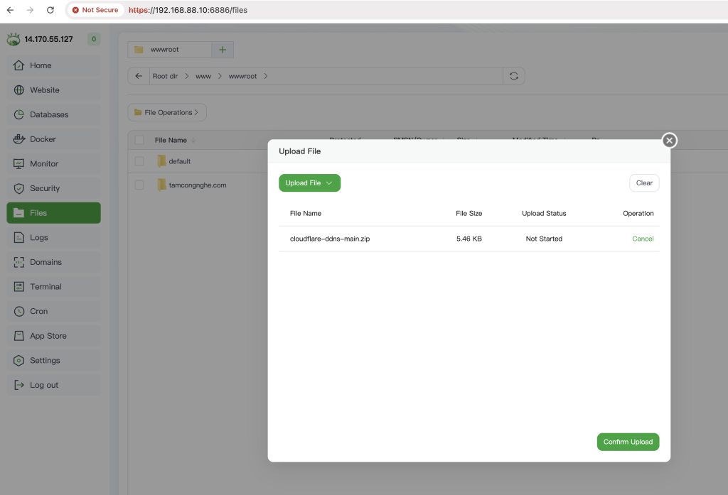 Tìm đến file cloudflare-ddns-main.zip trên máy của bạn, chọn nó rồi ấn Confirm Upload