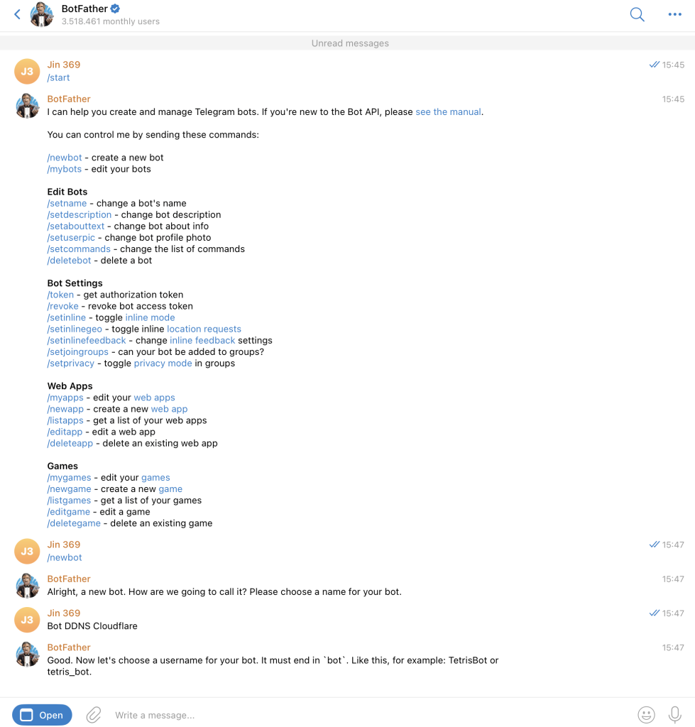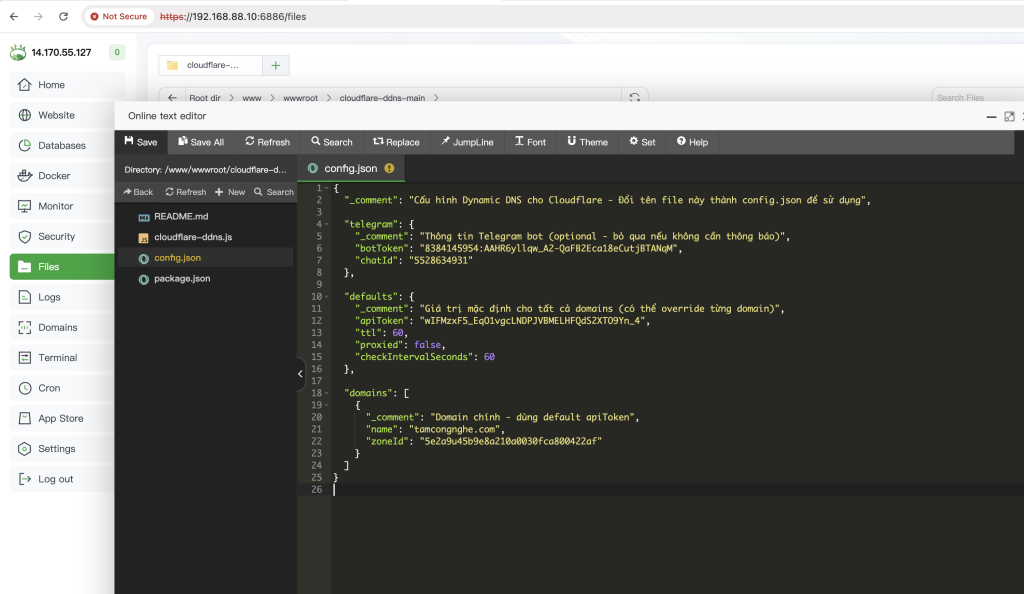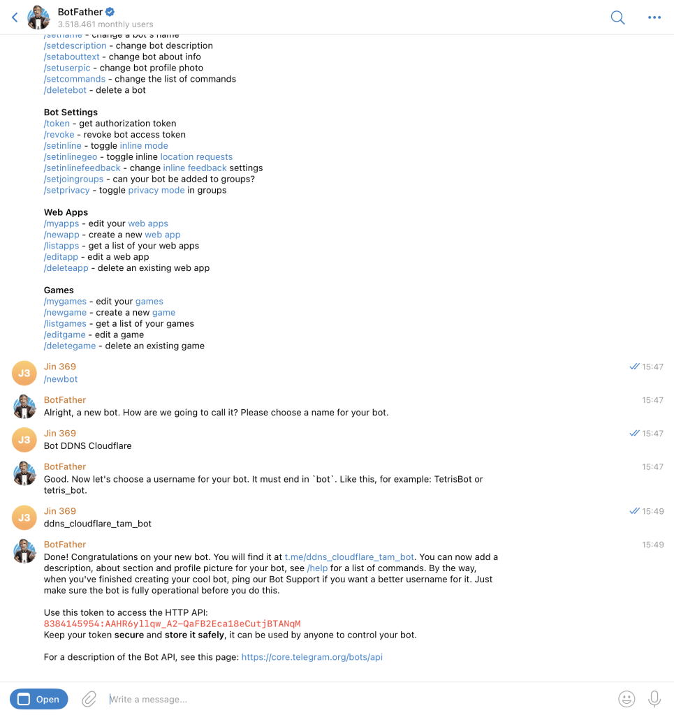 Nếu anh em muốn tự động gửi thông báo về telegram mỗi khi hệ thống phát hiện và cập nhật bản ghi cho tên miền trên Cloudflare thì có thể thêm Telegram bot vào.