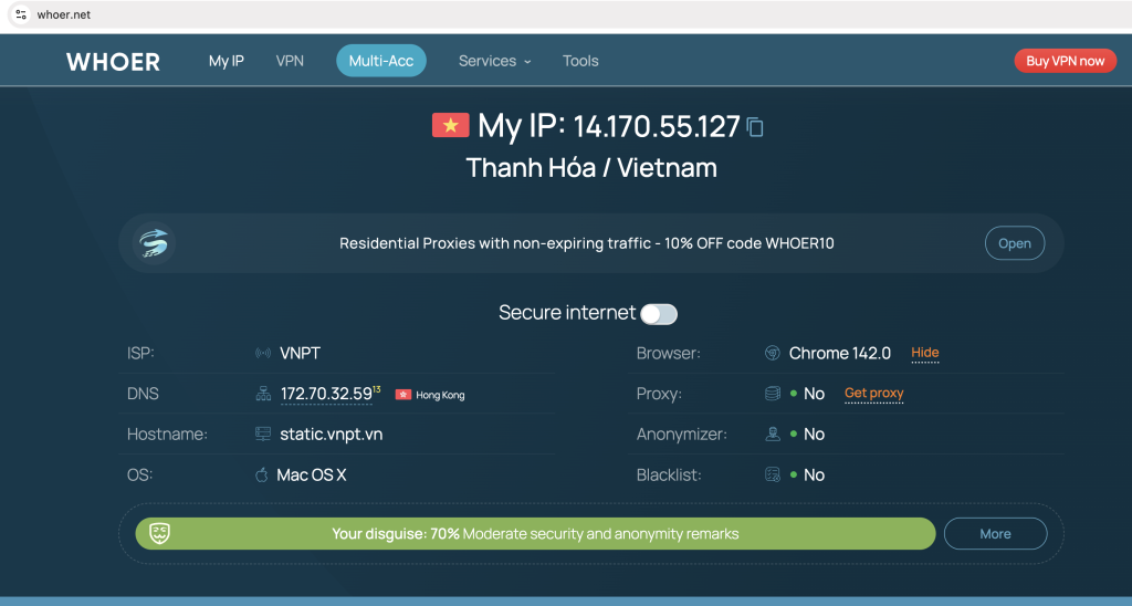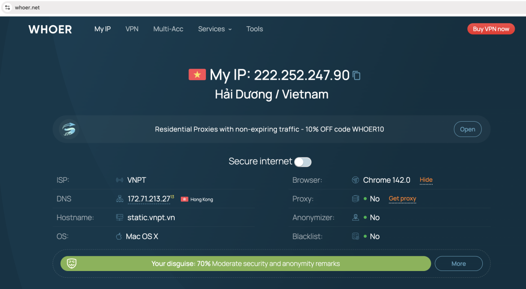 Bây giờ mình sẽ tắt nguồn Router, đợi khoảng 30 giây rồi bật lại để nó nhận địa chỉ IP công khai mới. Sau khi khởi động xong router, mình load lại trang whoer.net để kiếm tra và thấy ip đã thay đổi.