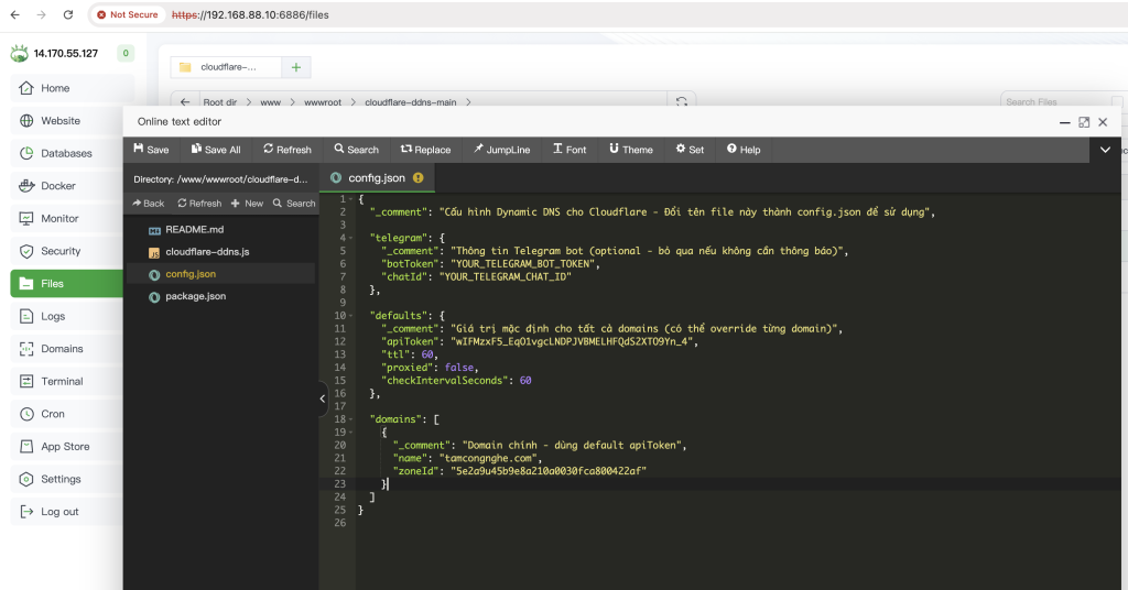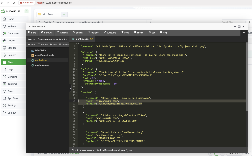 Copy giá trị của nó và paste vào file config.json, tại mục zoneId nằm trong domains. Đồng thời sửa mục “name” thành tên miền của bạn.