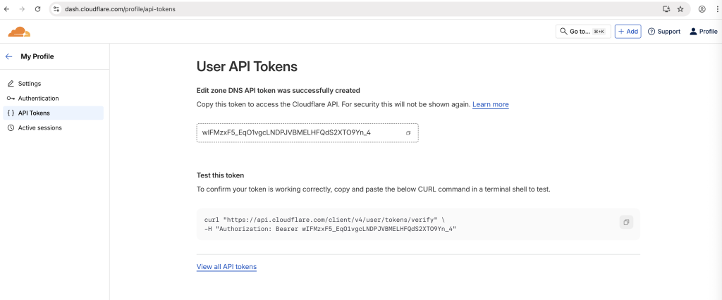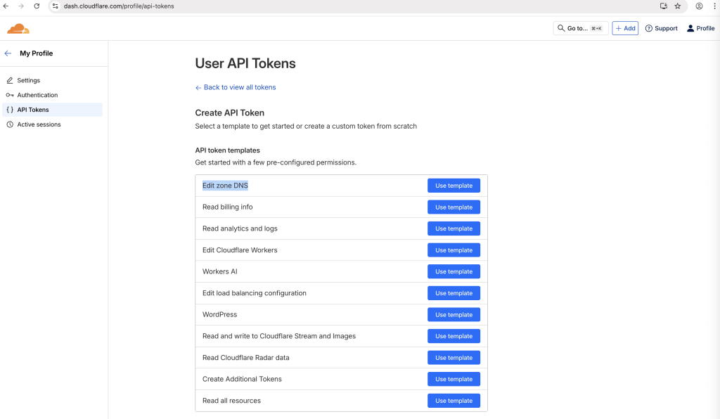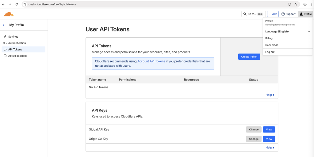 Đăng nhập xong thì truy cập vào https://dash.cloudflare.com/profile/api-tokens rồi chọn Create Token