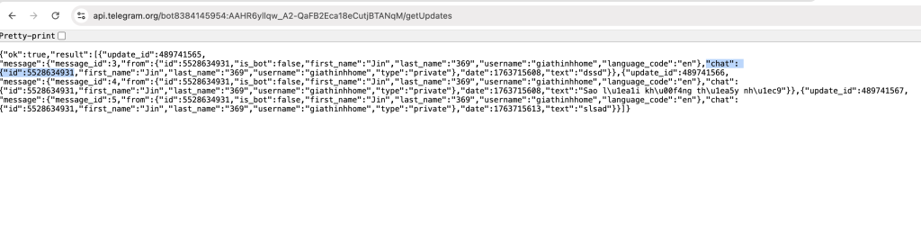 Còn mục YOUR_TELEGRAM_CHAT_ID, chúng ta sẽ lấy bằng cách gửi một tin nhắn bất kì đến bot mà chúng ta vừa tạo.