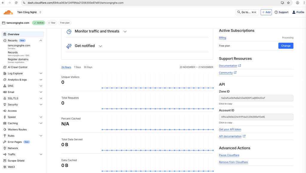 Quay trở lại tab của Cloudflare, chọn vào tên miền của bạn, kéo xuống dưới cùng phía góc tay phải màn hình sẽ thấy mục Zone ID.