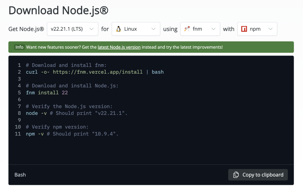Chọn phiên bản v22 cho Linux, sử dụng fnm với npm như hình phía dưới