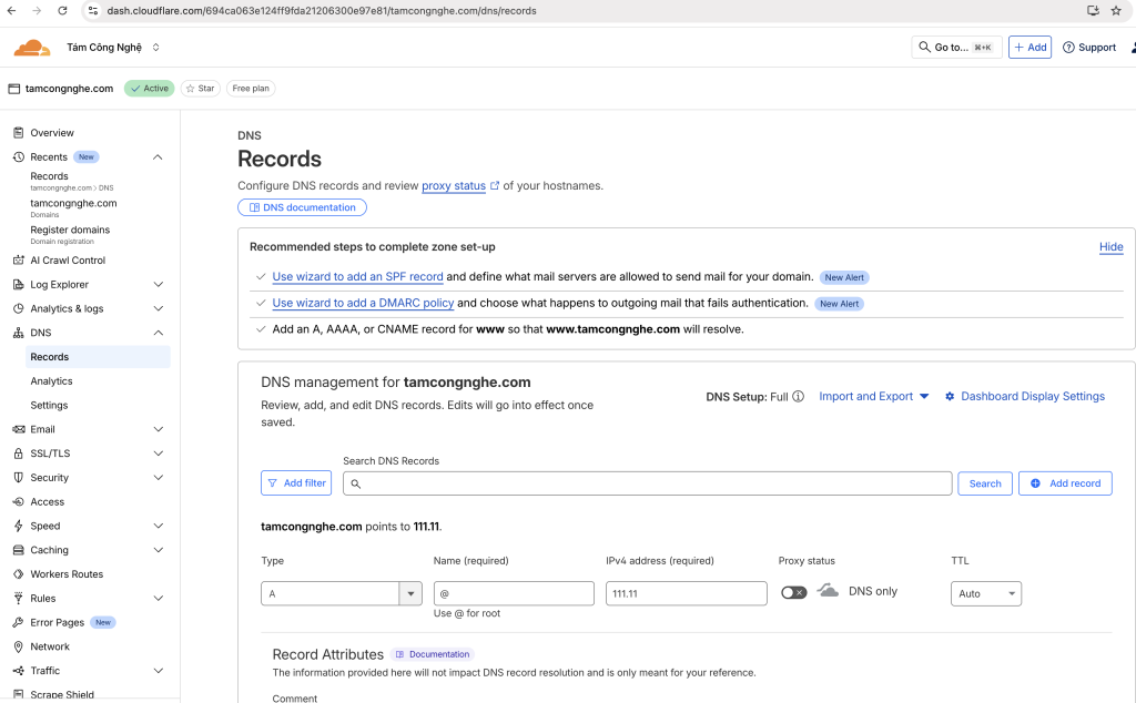 Còn một lưu ý khá quan trọng là tên miền của bạn cần phải có bản ghi A. Nếu chưa thêm, bạn vào Cloudflare -> vào tab DNS -> chọn Records. Sau đó tạo bản ghi A với IP bất kì.
