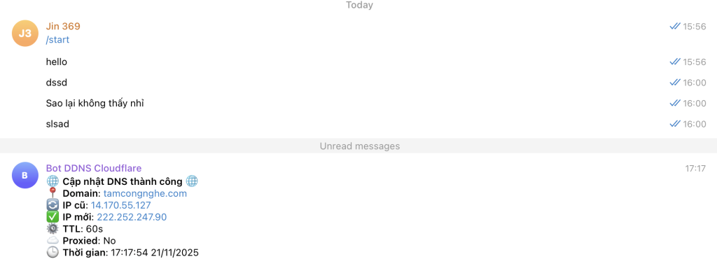 Mình cũng đã tích hợp chức năng gửi thông báo về Telegram cho chúng ta biết mỗi khi tên miền được cập nhật bản ghi mới.