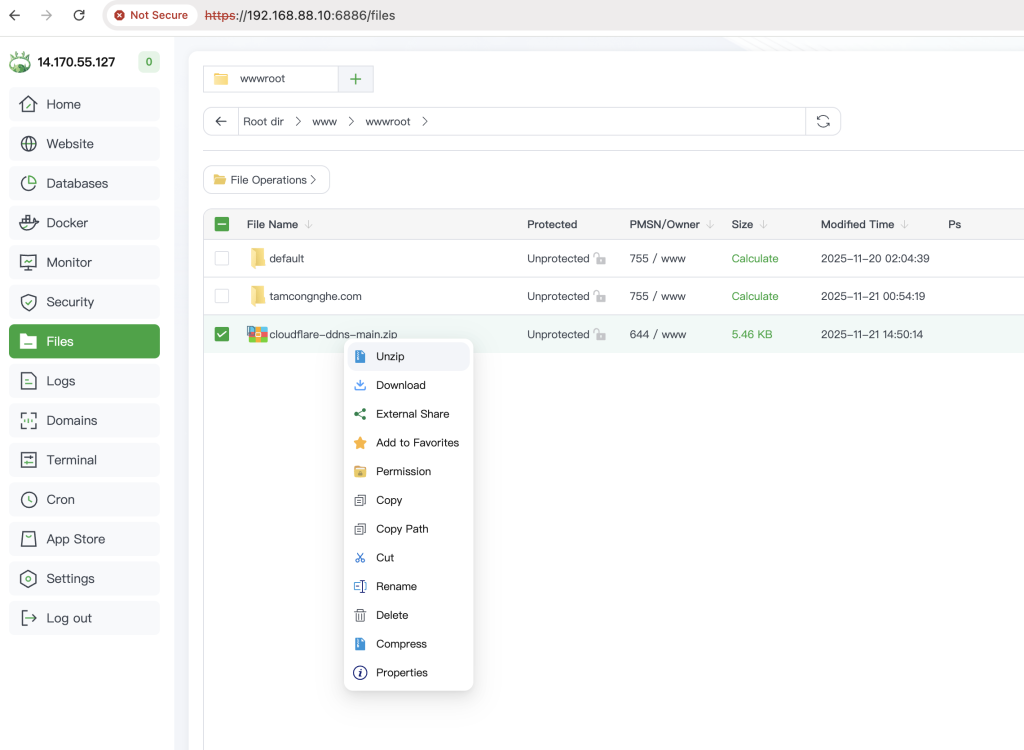 Di chuyển chuột đến file zip vừa tải lên, ấn chuột phải rồi chọn Unzip