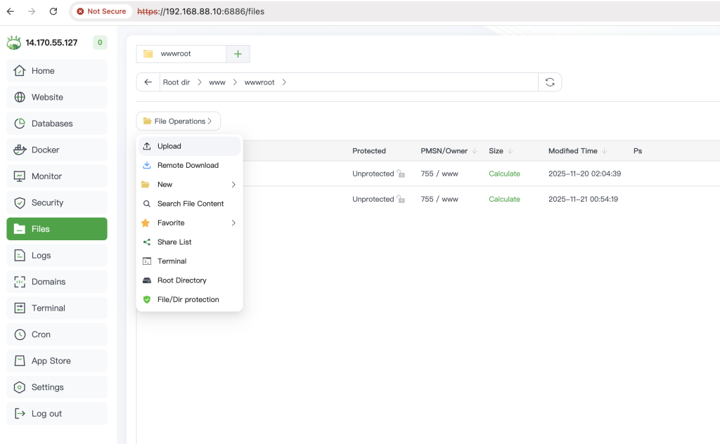 Vào lại giao diện của aaPanel, truy cập vào tab Files, chọn đến thư mục wwwroot. Tại đây di chuột vào File Operations -> chọn Upload